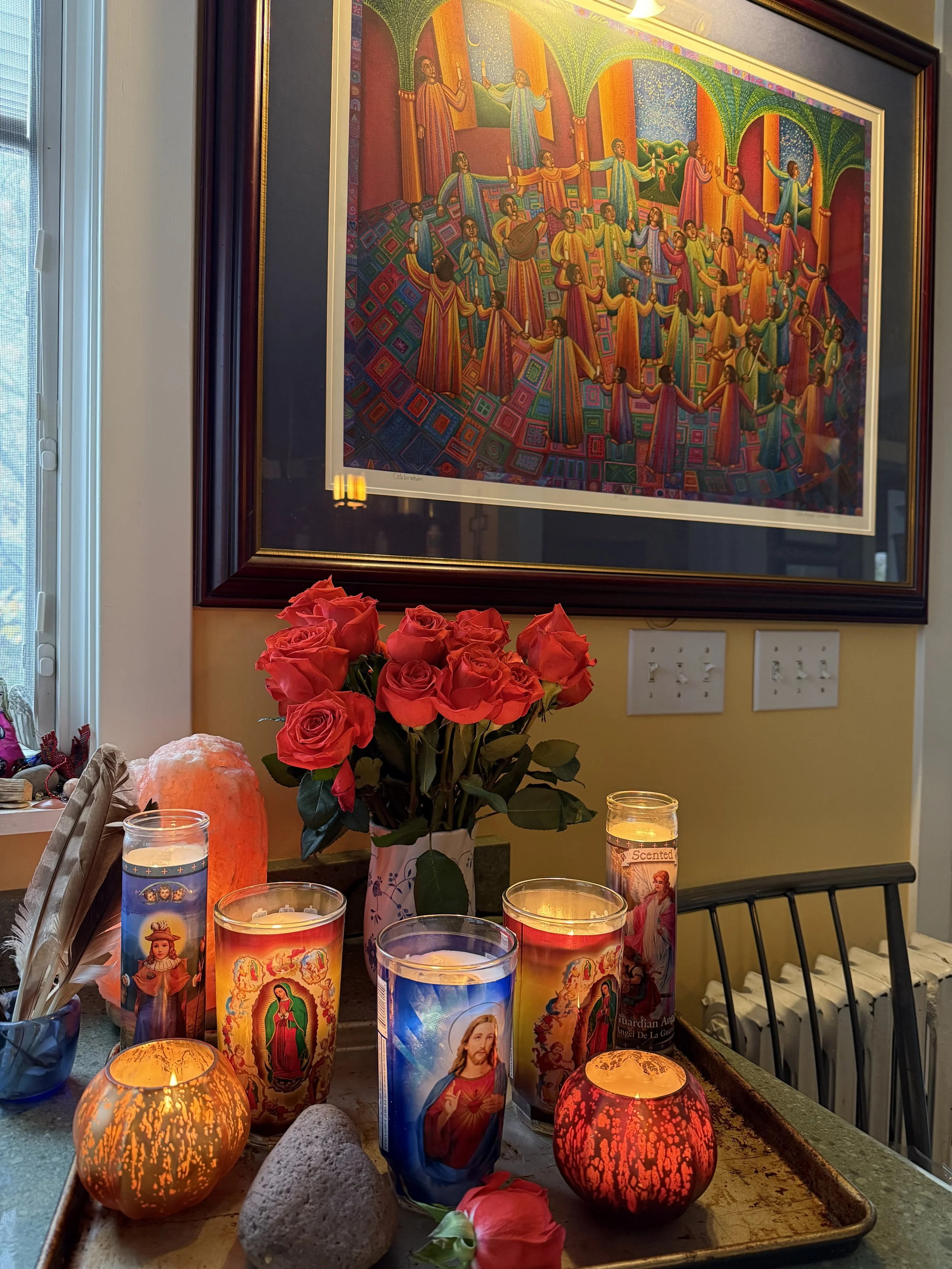 Tom and I recently set up an altar in our kitchen with candles and flowers as a prayer in support of particular values that are humanitarian, ecologically sound, American and most are reflective of President Abraham Lincoln as he lived his life and spoke his vision for the United States.